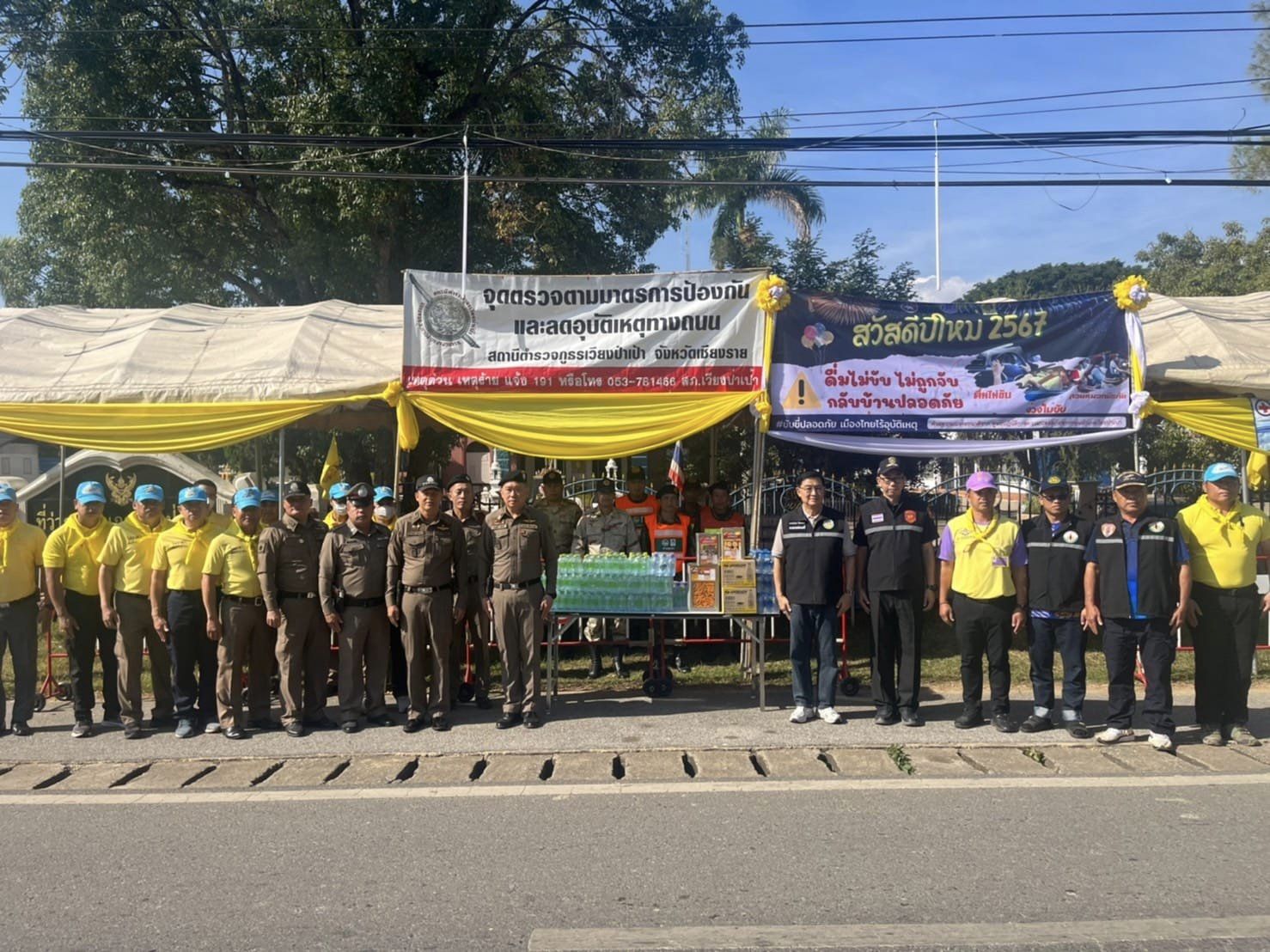 วันที่ 29 ธันวาคม 2566 เวลา 10.30 น.โดยการนำของ พ.ต.อ.นฤทธิ์ เกิดดี ผกก.สภ.เวียงป่าเป้า พ.ต.ท.สิราวิชญ์ พุ่มพวง รอง.ผกก.สสฯพ.ต.ท.อรรถพร บุรีคำ สวปฯชุดจิตอาสาได้ร่วมกับนายพรเทพ อ่องนก หัวหน้าสำนักงานขนส่งจังหวัดเชียงราย สาขาเวียงป่าเป้า /ว่าที่ รต.ณรงค์เดช จิระพงศ์ นายกเทศบาลตำบลเวียงป่าเป้าฯและฝ่ายปกครองนายบัญฑิต ขันพล ปลัดอำเภอฯ อสฯ พรสฯพร้อมคณะได้มามอบน้ำ-เครื่องดื่ม-ขนม กาแฟ ณ จุดตรวจบูรณาการและลดอุบัติเหตุทางถนนช่วงเทศกาลปีใหม่ พ.ศ.2567 พร้อมนี้ได้ แจกจ่ายน้ำดื่ม-แนะนำเส้นทาง แก่นักท่องเที่ยวที่สัญจรไป-มาในช่วงเทศกาลวันหยุดฯ บนถนนหลวงสาย 118 ด้วยความปลอดภัย