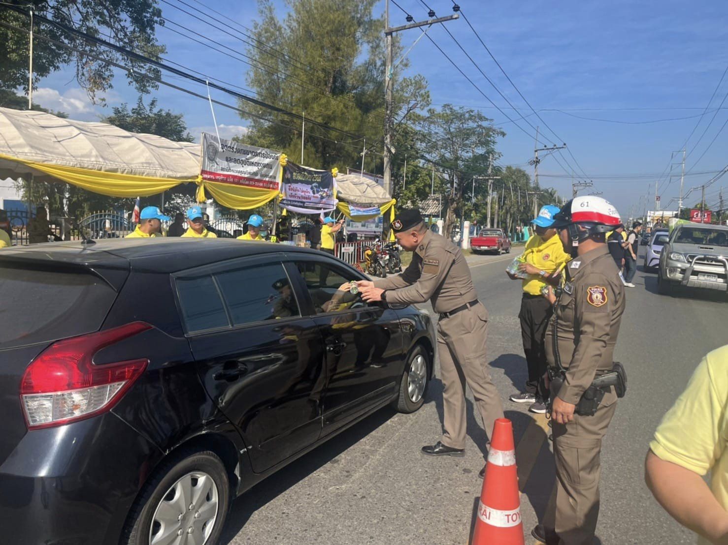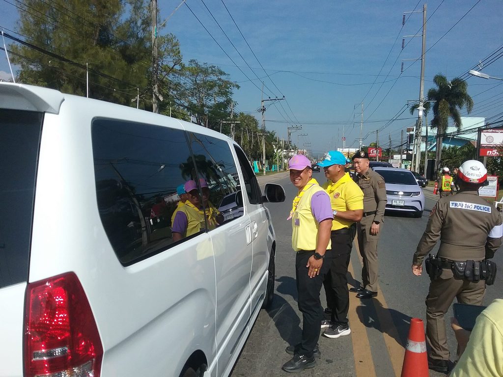 แจกจ่ายน้ำดื่ม-แนะนำเส้นทาง แก่นักท่องเที่ยวที่สัญจรไป-มาในช่วงเทศกาลวันหยุดฯ