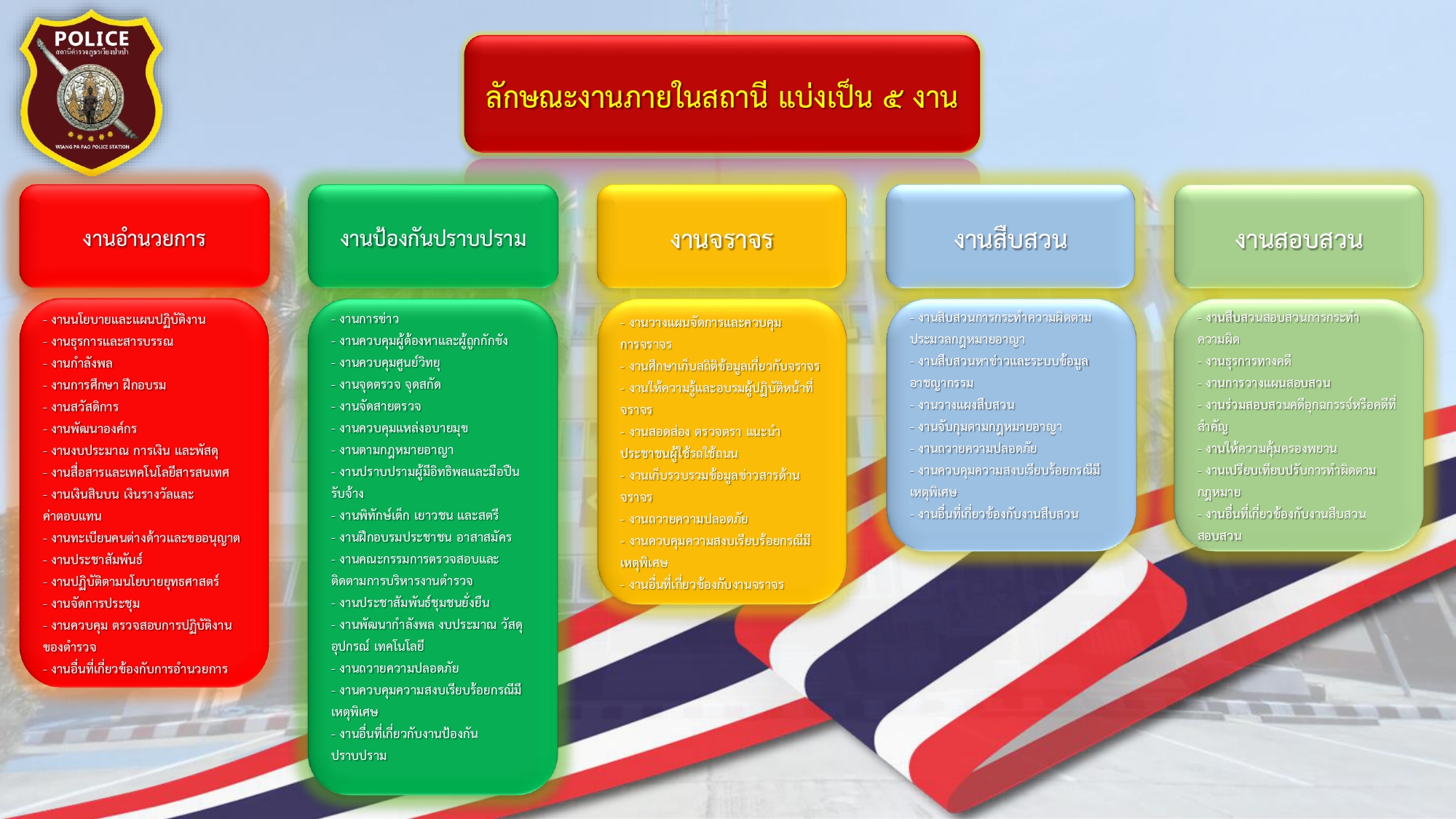 ซึ่งงานในสถานีตำรวจ แบ่งออกเป็น 5 สายงาน ดังนี้